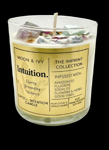 The Moon & Ivy Intuition Intention Candle is armed with a powerful trifecta of Amazonite, Fluorite and Sodalite, each charged under a full moon, the vibrations from this candle enable you to tap into your intellect and sixth sense. Inhale deeply and allow the Sandalwood and Cocoa Butter to envelop your aura.